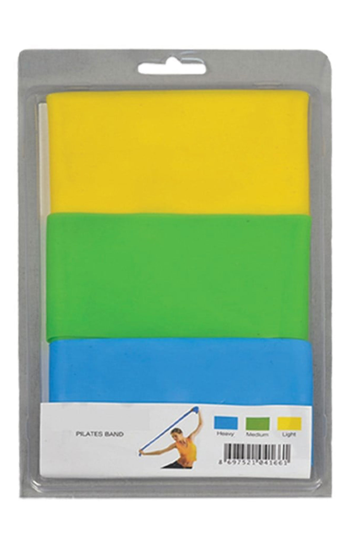 Üç adet pilates direnç bandı seti: sarı, yeşil ve mavi renkli bantlar.